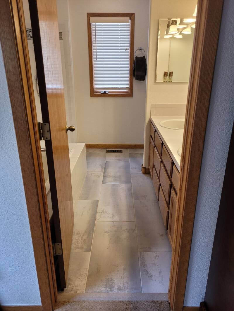 Oftentimes store bought transitions can't accommodate the height or width of the gap between the existing floor and the newly tiled space. As a carpenter as well as tile setter, when necessary, I enjoy creating custom oak transitions that look beautiful from the vantage of both rooms. This particular transition (above) is designed to match the new hardwood flooring which will be installed in the Spring, and for the transition below I created a perfectly cut fit, as well as a custom-colored stain to match the existing woodwork.